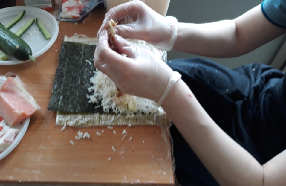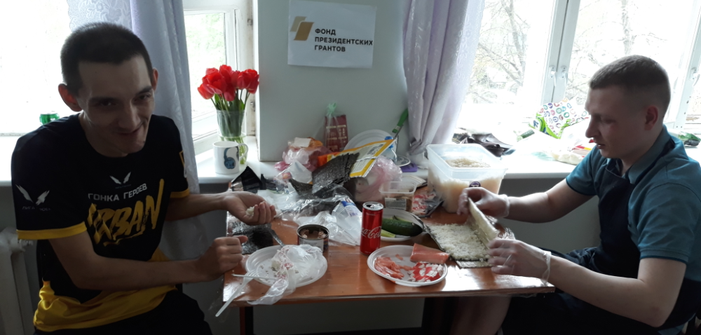 В рамках реализации проекта «Центр семейной реабилитации инвалидов. Качество жизни на равных!», 09 мая 2019 г. занятие по прикладному творчеству, организованное с использованием гранта Президента Российской Федерации на развитие гражданского общества, предоставленного Фондом президентских грантов, прошло в новом не обычном формате. К Дню Великой Победы для участников проекта был проведен кулинарный мастер-класс по приготовлению роллов от повара Виктора Борисова , направленный на развитие мелкой моторики.