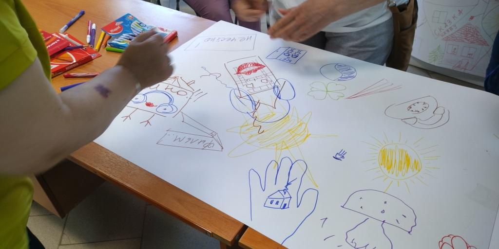 На первой станции – «Тренинговой» участники выполняли ряд последовательных заданий на сплочение, а именно на большом листе ватмана 3 команды рисовали свои города мечты. Каждый участник изображал свой дом и потом ребята прогладывали дороги друг к другу в гости тем самым создавая настоящий город! Название городов и стали названием команд – так у нас появились три новых города – «Сказка», «Домик в деревне» и «Сказка наяву».
