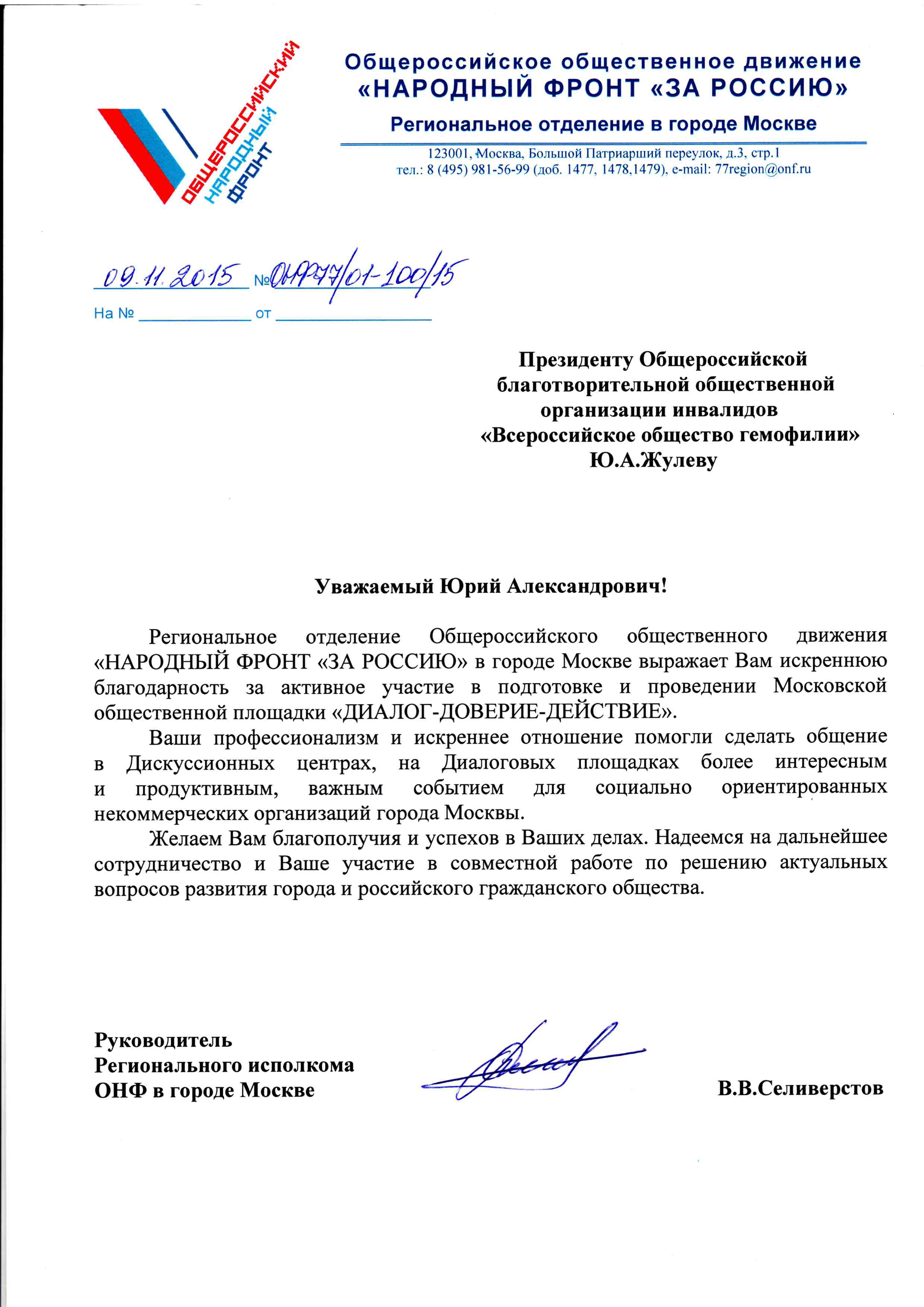 В адрес Президента Общероссийской благотворительной общественной организации инвалидов «Всероссийское общество гемофилии» Ю.А.Жулева поступило письмо из регионального отделения Общероссийского общественного движения "НАРОДНЫЙ ФРОНТ "ЗА РОССИЮ" в городе Москве. Движение выражает искреннюю благодарность за активное участие в подготовке и проведении Московской общественной площадки "ДИАЛОГ-ДОВЕРИЕ-ДЕЙСТВИЕ"