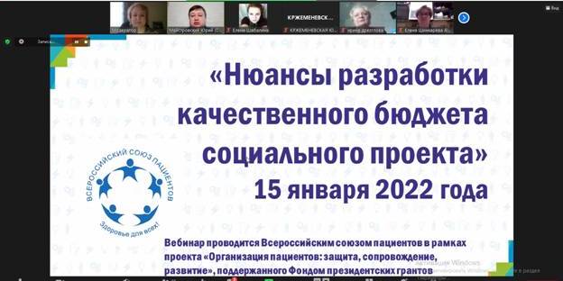 В онлайн формате прошёл вебинар «Нюансы разработки качественного бюджета социального проекта», который проводился Всероссийским союзом пациентов в рамках проекта «Организация пациентов: защита, сопровождение, развитие», поддержанного Фонд президентских грантов.