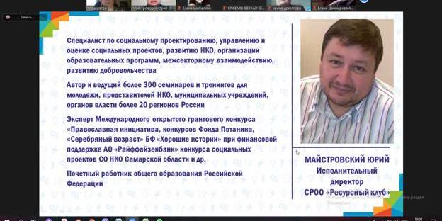 В вебинаре приняли участие представители пациентских организаций РФ. Юрий Майстровский исполнительный директор СРОО «Ресурсный клуб», специалист по социальному проектированию, управлению и оценке социальных проектов представил участникам вебинара презентацию, в которой показал как формировать бюджет проекта.