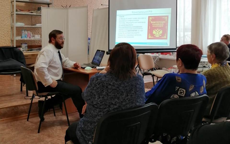 На встрече обсуждались вопросы о получении бесплатной медицинской помощи по полису ОМС, представлена презентация «Программа госгарантий РФ 2020», «Организация бесплатной медицинской помощи в Российской Федерации». Спикер рассказал о возможности получения правовой информации на Горячей линии по защите прав пациентов.