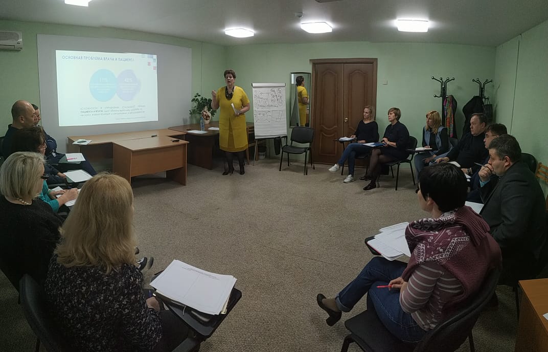 Во второй день тренинга, в ходе изучения модели пациент-ориентированной модели медицинской консультации и интерактивного изучения навыков эффективного взаимодействия врача и пациента ведущей Песневой О.В. отмечено, что в паспорте приоритетного проекта «Обеспечение здравоохранения квалифицированными специалистами» («Новые кадры современного здравоохранения») одной из ключевых задач является обеспечение качественной медицинской помощи, одним из индикаторов которой выступает количество жалоб пациентов в отношении оказанных медицинских услуг. Анализ структуры жалоб эксплицирует следующее: «90% конфликтов возникает из-за неумения или нежелания врача объяснить пациенту или его близким информацию о состоянии здоровья».