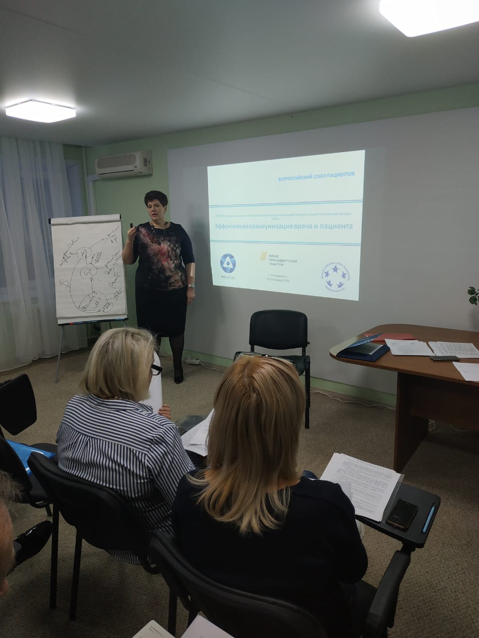 Ведущая тренинга Песнева О.В. – Советник по здравоохранению Всероссийского союза пациентов, член федеральной рабочей группы Комиссии по здравоохранению Общественного Совета Государственной корпорации «Росатом». Во вступительном слове Песнева Ольга Вячеславовна отметила, что главной целью проекта является повышение уровня бесконфликтного и партнерского взаимодействия пациентов и врачей в городах присутствия ГК Росатом. Знание своих прав пациентом, правовых основ профессиональной деятельности медицинским работником является весьма важным фактором при взаимодействии «врач-пациент» для повышения качества оказываемой медицинской помощи и снижения социальной напряженности.